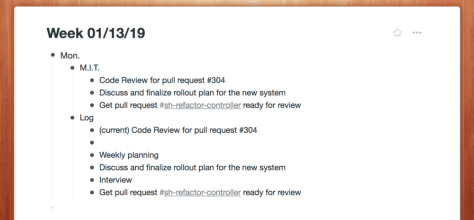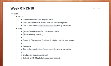 Here is how I apply it to my day-to-day work. After I get to the office, first thing in the morning, I open my note-taking app (I use Workflowy). First off, I start a new section for the day and write down two to three most important tasks I want to focus on and get done under the M.I.T. section. Then I list out tasks, both M.I.T.s and non-M.I.T.s, in the order I plan to do them under the log section. I then check my schedule for the day and plan blocks of time for the M.I.T.s. I will try to get them done as soon as possible.