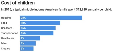 In 2015, American parents spent, on average, US $233,610 on child costs from birth until the age of 17, not including college.